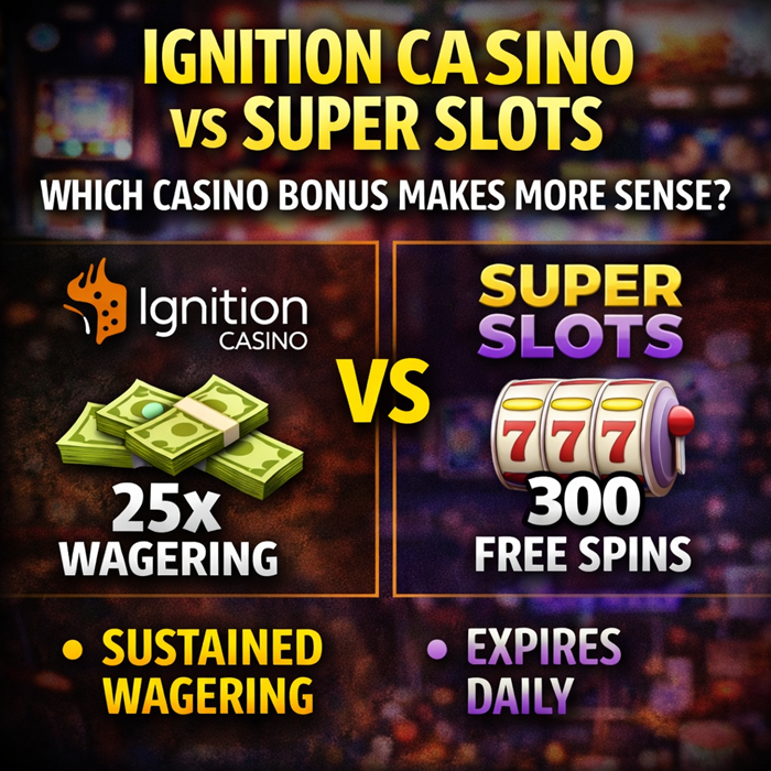 Casino bonus comparisons are only useful when they focus on how offers actually behave once play begins. Headline percentages and spin counts rarely explain how long funds are locked, which games meaningfully advance wagering, or how easy it is to make a costly mistake. This comparison looks strictly at bonus structure and rules, using Super Slots as the baseline and Ignition Casino as the contrast.