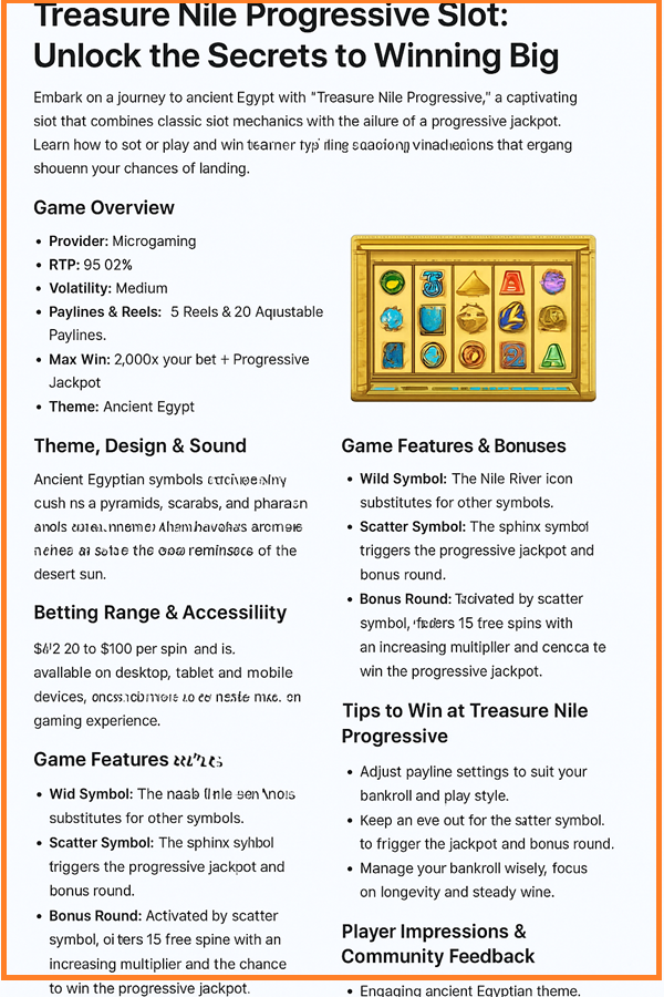 Step into the golden sands of ancient Egypt with Treasure Nile Progressive, a classic Microgaming jackpot slot where every spin holds the potential for life-changing rewards. With simple mechanics, iconic symbols, and a progressive jackpot that can strike on any max-bet spin, players can boost their winning odds by managing bet size, understanding symbol value, and targeting paylines effectively. This game offers a nostalgic, fast-paced experience ideal for jackpot hunters and fans of streamlined gameplay.