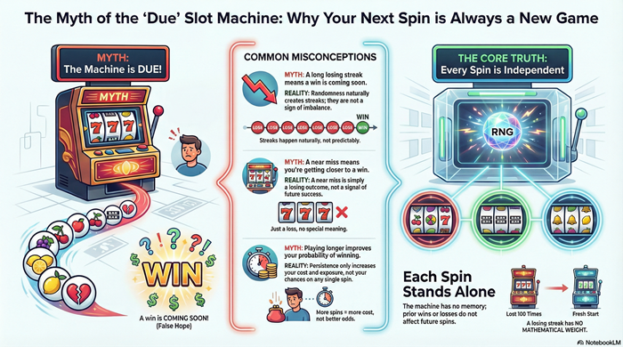 But slots are never due. They don’t track history, compensate for losses, or rebalance outcomes. The belief that they do is one of the most persistent and expensive misunderstandings in gambling. To see why this belief feels so convincing, you have to separate human intuition from mathematical reality. As explained in our guide on how slot machines really work, every slot spin is independent and governed by fixed probabilities, regardless of what came before.