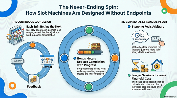 This article explains why slot machines lack natural endpoints, how that design affects player behavior, and why stopping feels unnatural even when play is no longer enjoyable.