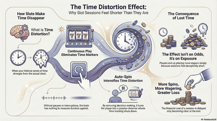 This article explains why slot sessions feel shorter than they are, how time distortion works, and why it materially increases the cost of play without changing odds.